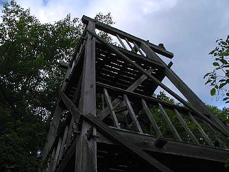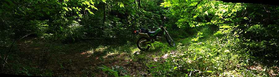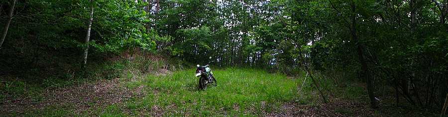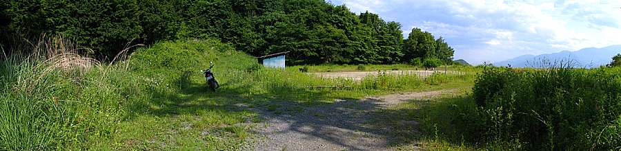 | 午後4時59分 終点へ到着。 終点は20m四方の空き地になっている。 木々に囲まれているので景色的には乏しいが、北西側に立つと八ヶ岳や国道141号を僅かに望める。 なおバイクはここまでだか、空き地の先端から約5分ほど歩くと3層の見晴らし台が建っている。 |