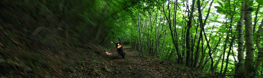 午後14時58分 山の裏側へ出た道は尾根直下を稜線に沿って西へと進む(手ブレでボケボケ)。 |