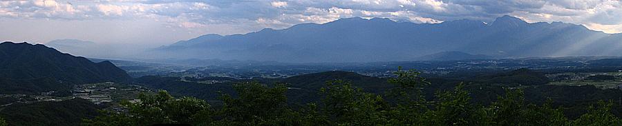 午後5時10分 見晴らし台の最上階まで登ると甲斐駒ヶ岳、鳳凰三山、富士山、八ヶ岳などの山々が連なり、その下には韮崎市、武川村、白州町などの町並みが広がっている。 当日は残念ながらやや陽が陰ってしまったが、晴れた日ならもっと素晴らしい眺望を見られることだろう。 |