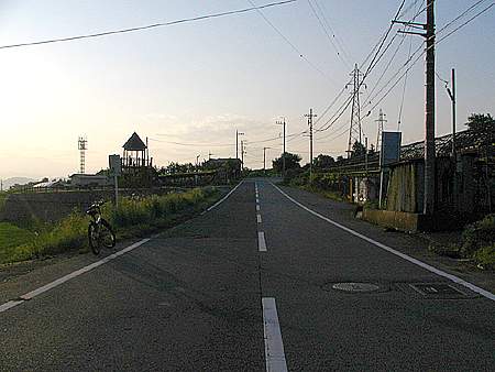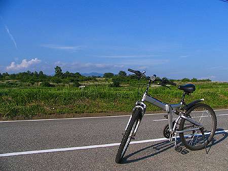午後5時17分 双葉町からは県道616号で韮崎市へと向かう。 ちなみに自転車は近くのホームセンターで買った折り畳み自転車。 1年ほど前に19800円で買ったのだが、なんとその翌週の特売チラシでは半額以下の9800円。そりゃないぜ..... |