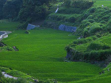 | 午後5時5分 双葉町大垈地区。 緩やかな傾斜地帯には遙か先まで水田地帯が続いている。 遠目に見ると色鮮やかな緑の絨毯だ。 |